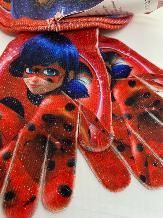 SET BERRETTO GUANTI MIRACULOUS BAMBINA DISNEY LADY BUG TG UNICA PAPALA brillanti
