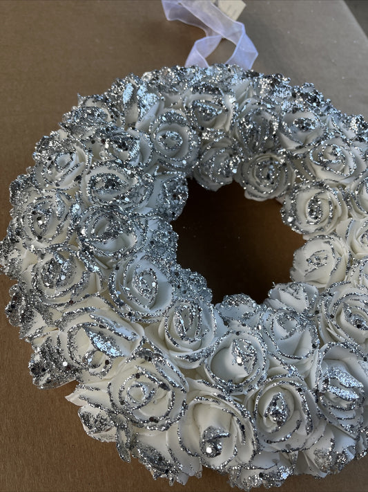Ghirlanda di rose bianche con glitter argento da appendere 29 cm